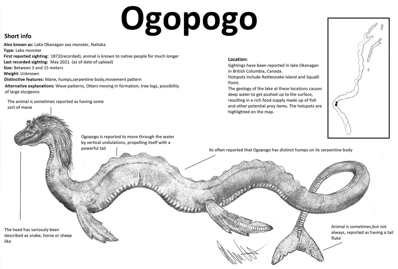 - Ogopogo, makhluk dari Danau Okanagan di Kanada, digambarkan sebagai ular laut dengan tonjolan di punggung, sering terlihat melengkung seperti naga berenang.